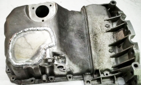 Проверенным способом ремонта данной детали является сварка поддона двигателя аргоном. Даже если картер разлетелся на отдельные части, опытные специалисты соберут его по линиям разлома и сварят. В других случаях могут быть изготовлены алюминиевые заплатки.
